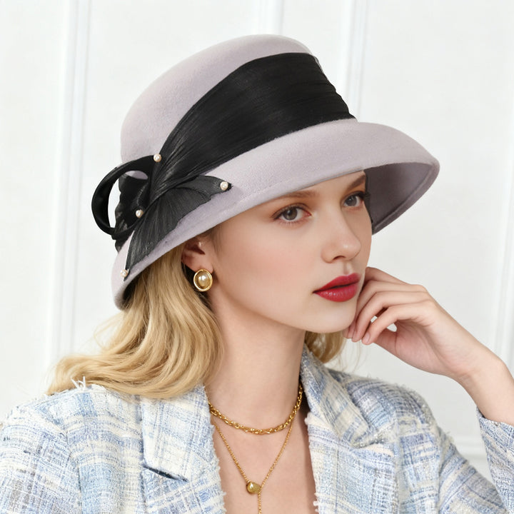 Crafted from wool decor with a premium blend of lustrous silk and durable abaca fibers, this winter cocktail cloche is elegantly embellished with delicate beads, creating a subtle shimmer and refined texture. Perfect for upscale winter events, festive church services, or formal gatherings, this hat merges artisanal craftsmanship with graceful embellishment for an unforgettable seasonal statement.
